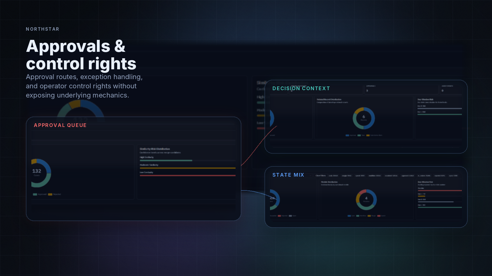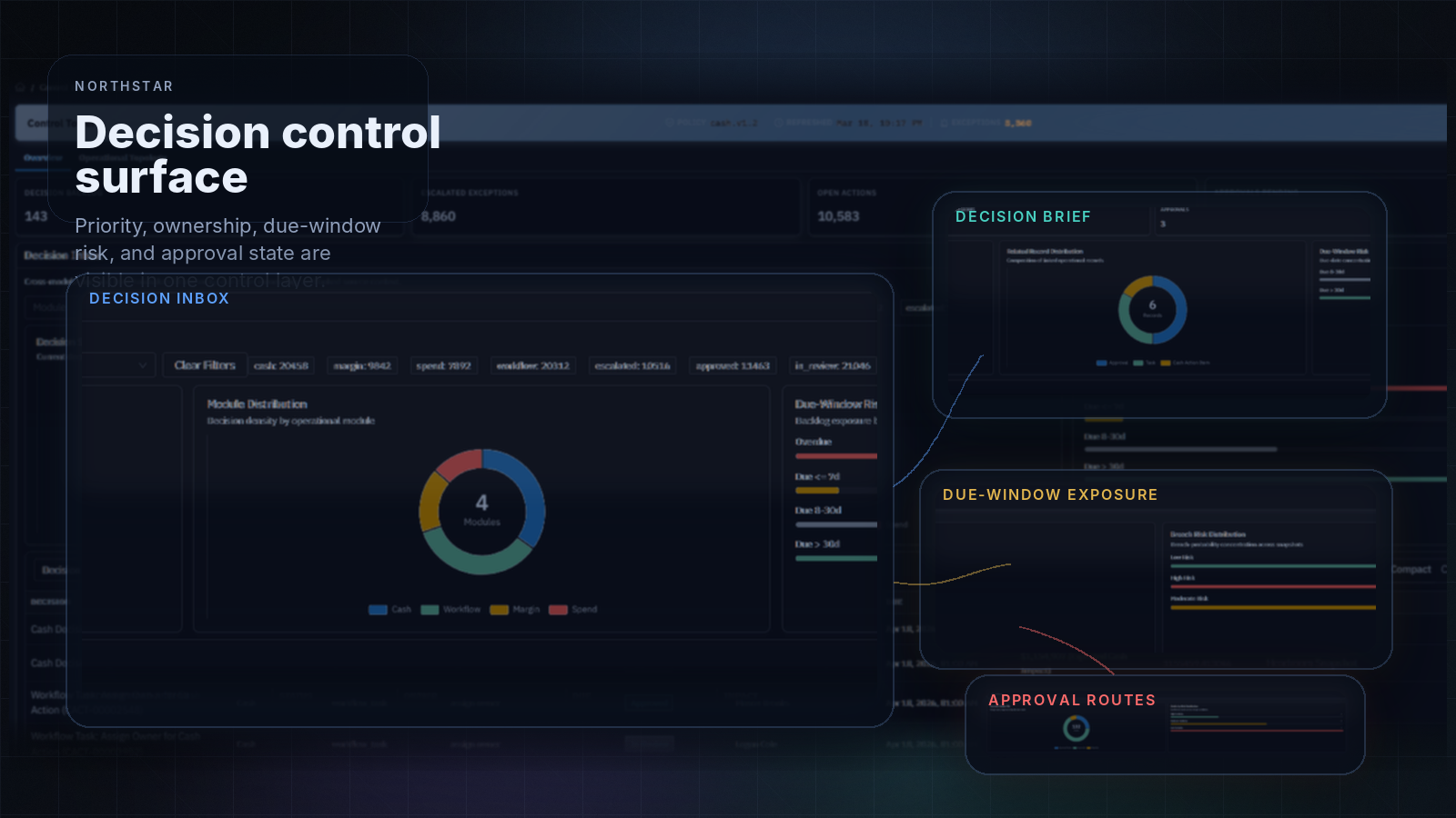 Northstar brings queue pressure, action ownership, approvals, and operating posture together so finance is not stitching interventions across inboxes, spreadsheets, and after-the-fact review.