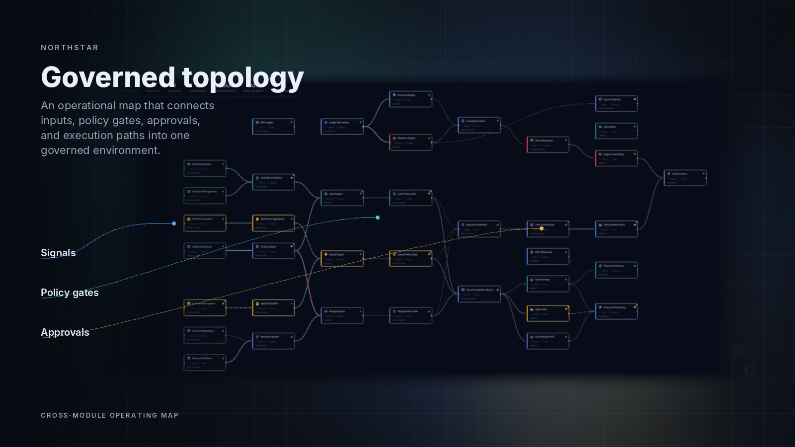 Northstar maps data sources, engines, approval gates, and output paths into one executive view so finance can see how pressure, controls, and interventions connect before a walkthrough moves into specifics.